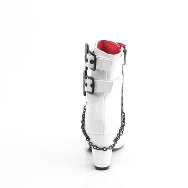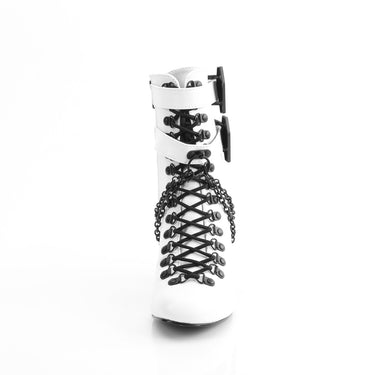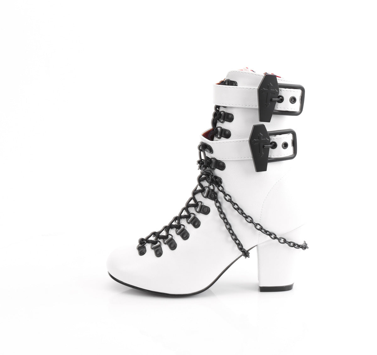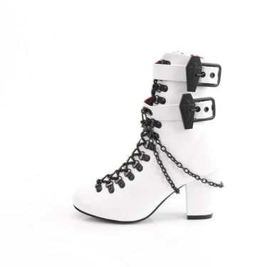 Elevate your footwear collection with the mesmerizing Vivika-128 boots. This ankle boot style captivates with its 3" block heel and rounded toe, providing a sturdy and stylish base. The design is taken to the next level with a D-ring lace-up front, double coffin buckle straps, and an eye-catching O-ring plate, emitting a vibe of gothic romance. The dramatic allure is further intensified by double hanging chains looped through the heel channel and encircling the heel, all crafted from pristine white vegan leather, making these boots a symbol of alternative luxury.